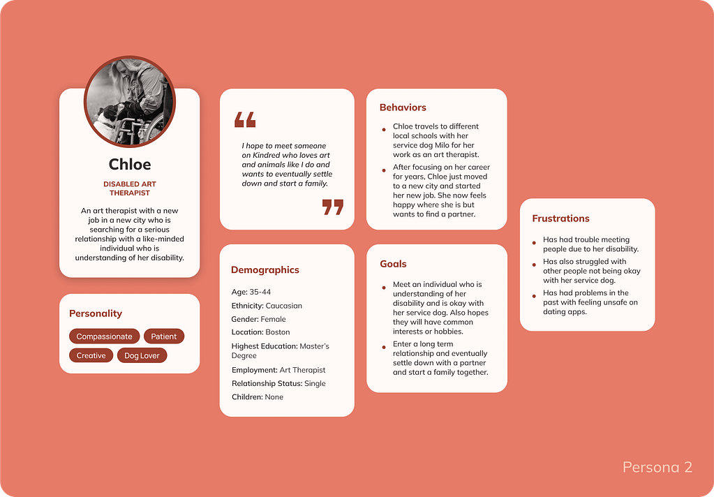 Chloe is a disabled art therapist who needs a dating app that can connect her with a like-minded individual understanding of her disability because of her past challenges with incompatible individuals.