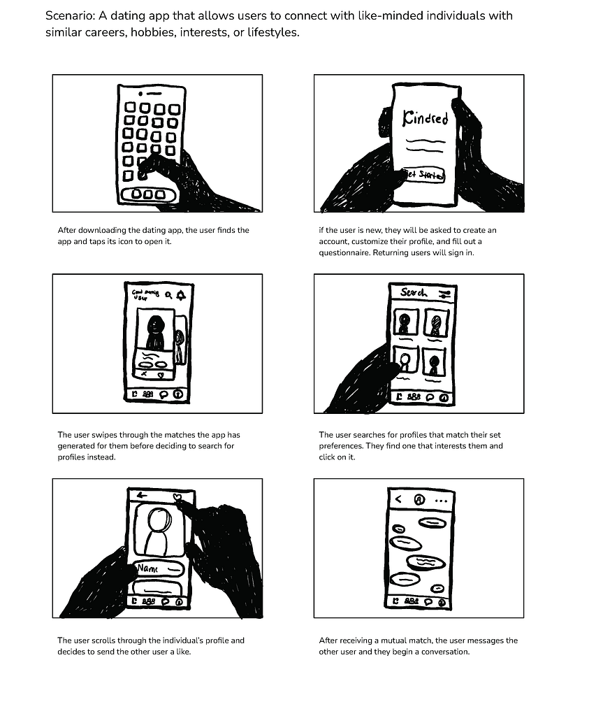Follows a user’s experience interacting with the Kindred app, from creating their profile to swiping and searching for profiles and receiving a mutual match.
